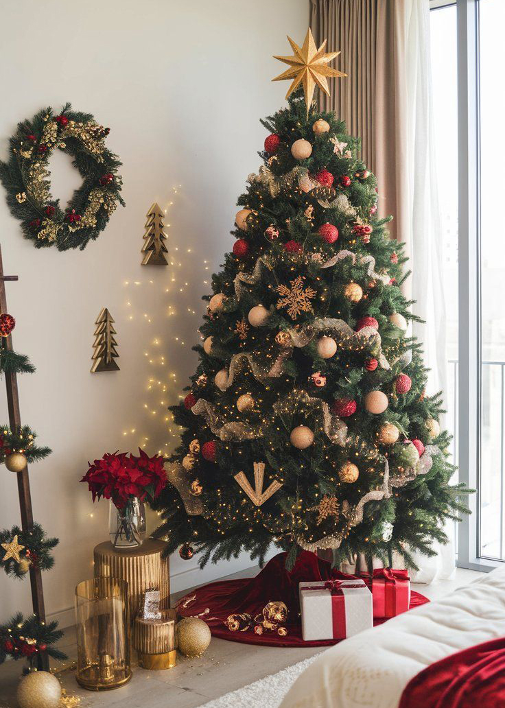 👉 Consider the ceiling height and available space. Always leave 30–50 cm above the tree for a star or topper.