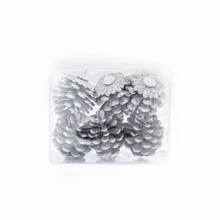 Set of 6 glittery silver pine cones to hang on your tree to match your Christmas decorations.
