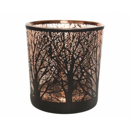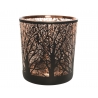 Een glazen kaarsenhouder met een verfijnd boomtakkenpatroon in zwart en koperkleur.